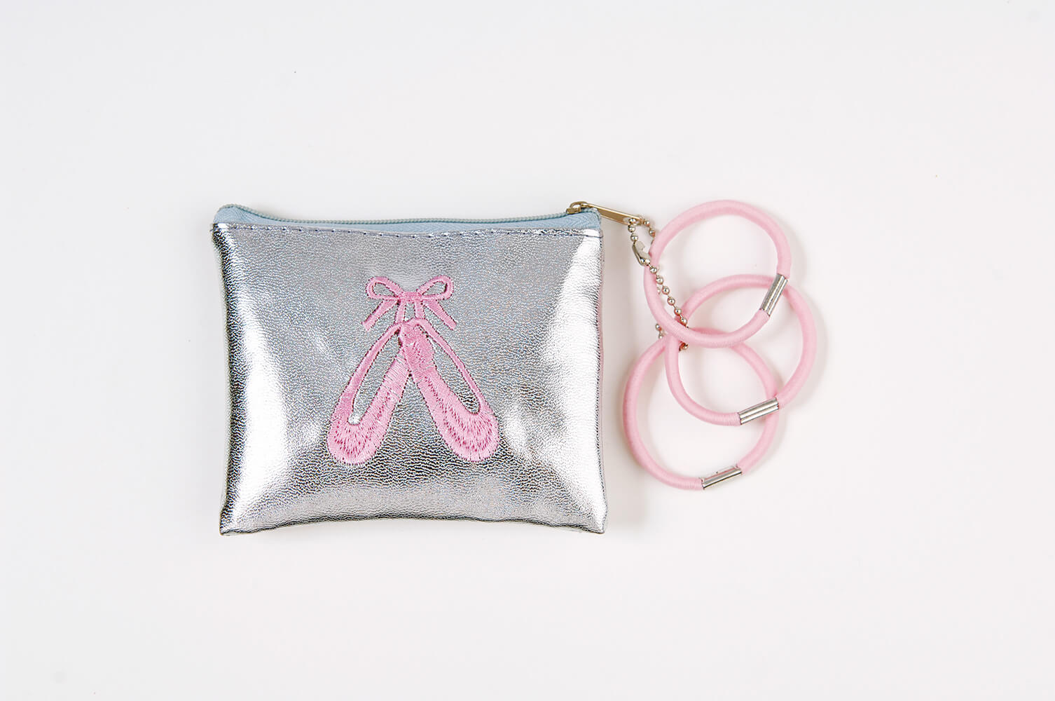 Liten pung med tåspissmotiv. Det følger med 3 rosa hårstrikker. Fin å ha hårnåler og småtterier i.